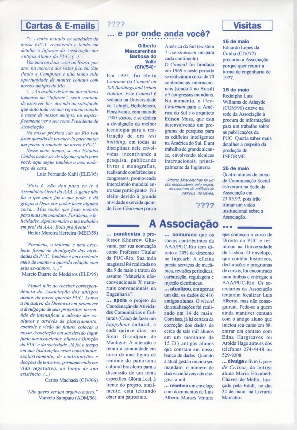 Seção de cartas e e-mails, de 'por onde andam ' ex- alunos, visitas e comunicações da Associação dos Antigos Alunos da PUC-Rio para com os seus leitores.