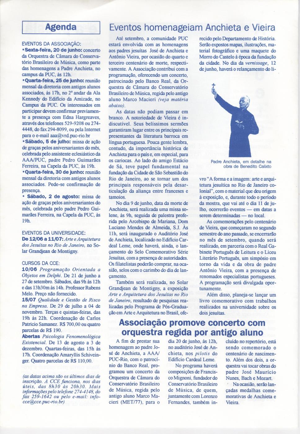Agenda de alguns eventos da PUC-Rio e um artigo sobre os eventos em homenagem ao pe. José de Anchieta S.J. e ao pe. Antonio Vieira que viriram a ser realizados.