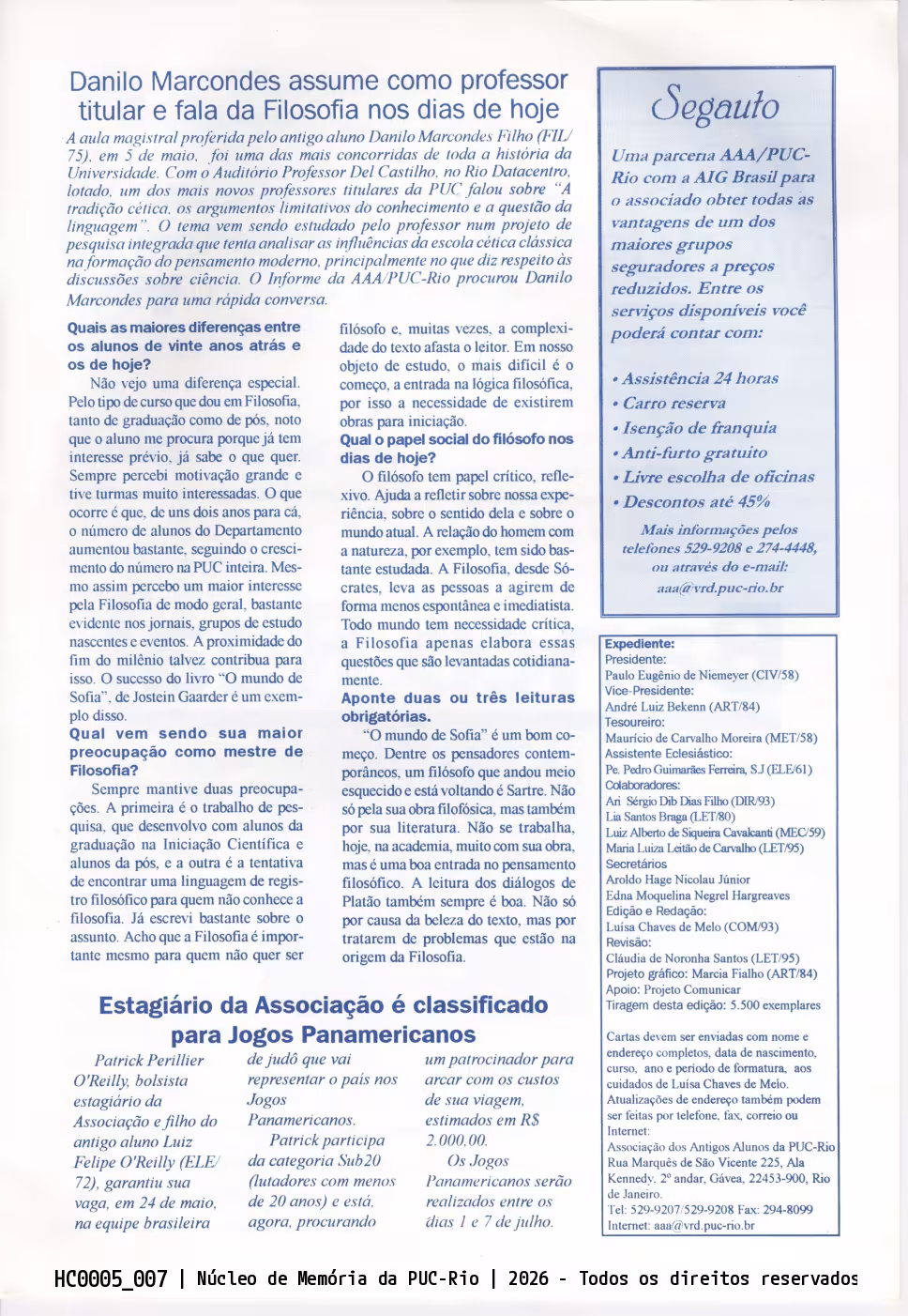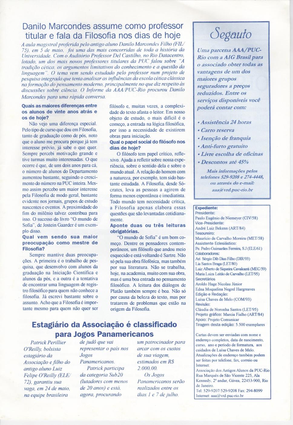 Entrevista com o prof. Danilo Marcondes do Departamendo de Filosofia e a notícia de um estagiário da Associação dos Antigos alunos da PUC-Rio que iria representar o Brasil nos Jogos Panamericanos no judô.