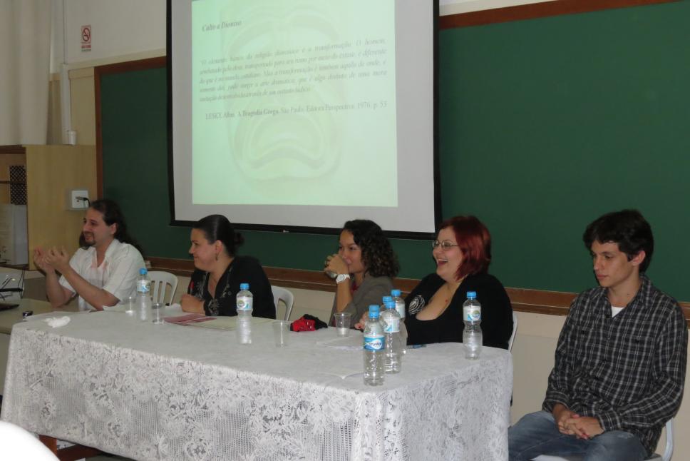 Palestrantes da mesa II da Jornada de História Antiga, com o tema Deuses e Heróis na antiguidade greco-latina. O aluno de graduação Daniel Queiróz fala sobre o êxtase e a ordem na tragédia grega.