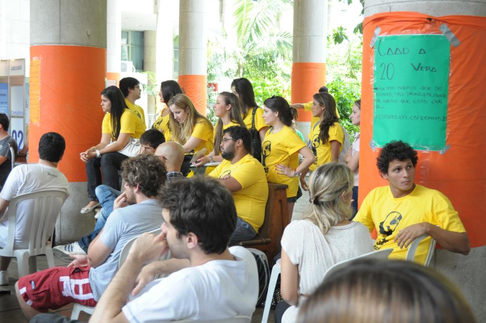 Debate das chapas concorrentes ao CACOS. Presentes alunos do curso de Comunicação Social e alguns de outros cursos. Debate mediado por um membro do DCE. Colados nos pilotis, cartazes de uma chapa concorrente ao CA de Administração (em verde) e de uma chapa concorrente ao CA de Direito (em laranja).