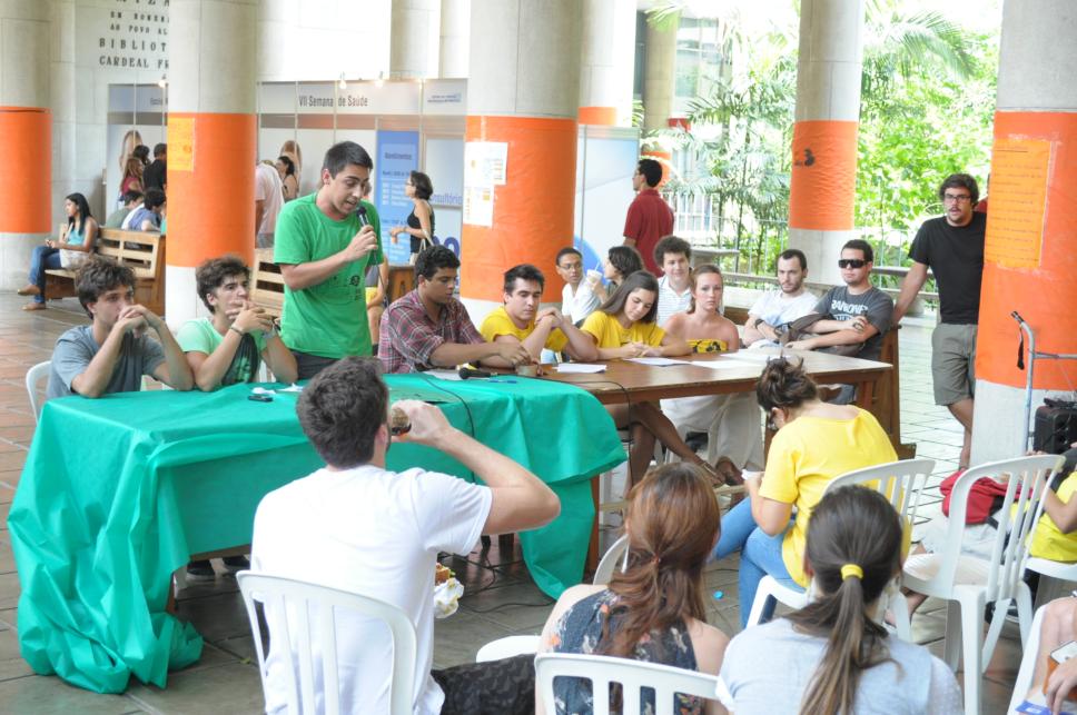 Debate das chapas concorrentes ao CACOS. Presentes alunos do curso de Comunicação Social e alguns de outros cursos. Debate mediado por um membro do DCE. Nos pilotis cartazes colados de uma chapa concorrente ao CAEL.