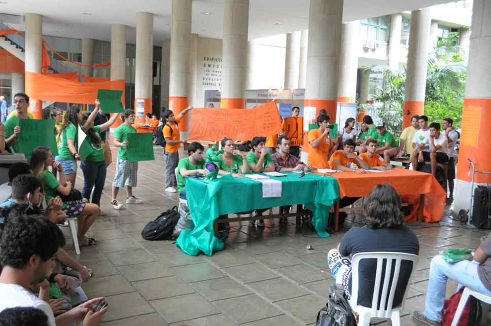 Debate das chapas concorrentes do CAAD, presentes alunos do curso de Administração e alguns de outros cursos. No pilotis faixas e cartazes de chapa concorrente ao CAEL. Alunos levantam cartazes das chapas que apoiam.