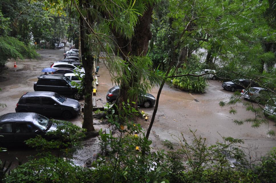 Estacionamento atrás da Ala Kennedy em dia de forte chuva.