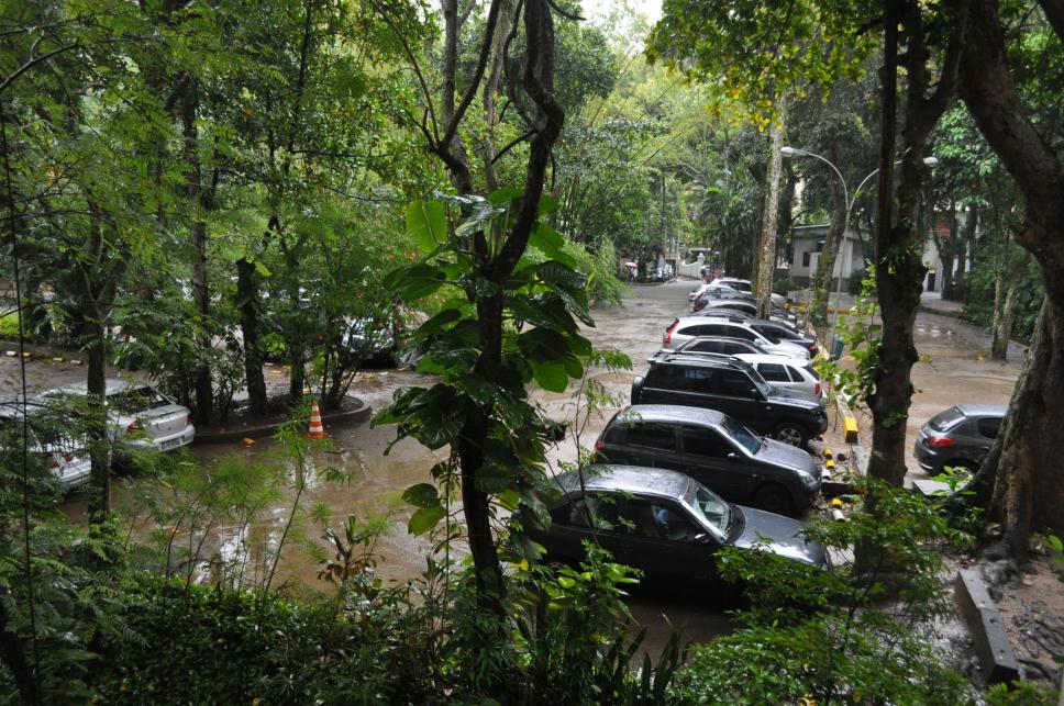 Estacionamento atrás da Ala Kennedy em dia de forte chuva.