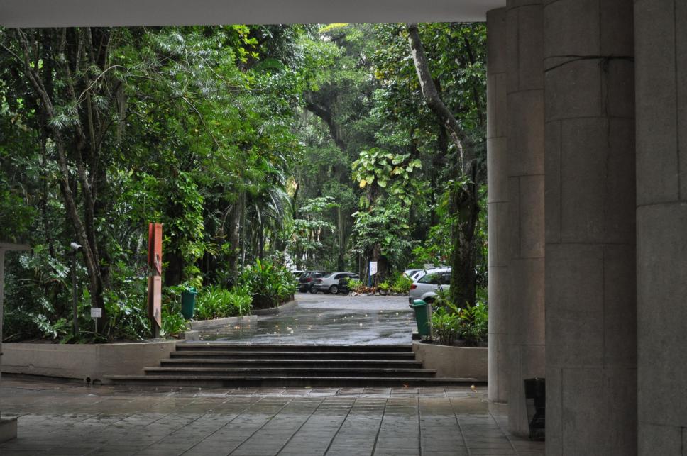 Vista da Ala Kennedy em direção ao Bosque da PUC em dia chuvoso.