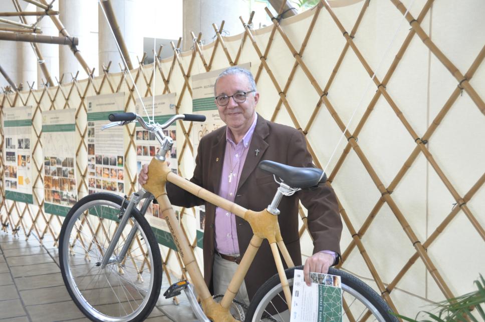 O Reitor pe. Josafá S.J. na abertura da exposição Mostra 2011, de estruturas de bambu, com a Bambucicleta, bicicleta feita à base de bambu.