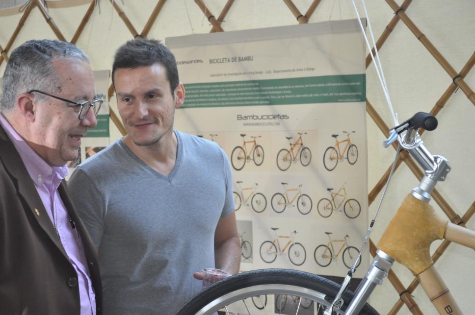 O Reitor pe. Josafá S.J. na abertura da exposição Mostra 2011, de estruturas de bambu, com a Bambucicleta, bicicleta feita à base de bambu.
