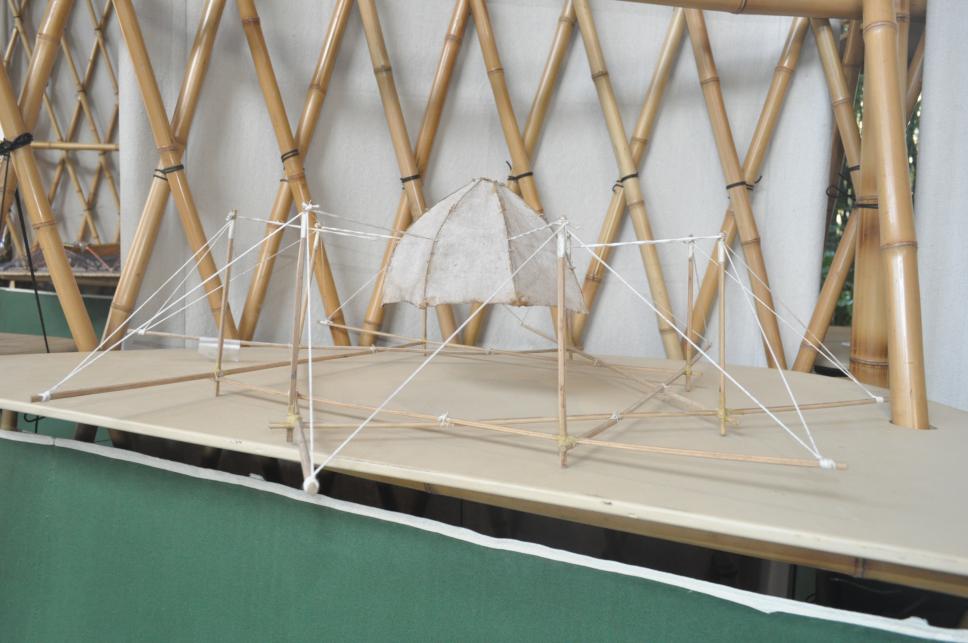 Exposição com estruturas e objetos feitos com bambu onde se mostra o uso de materiais não convencionais e tecnologias sustentáveis. Trabalho em barro, Laboratório de Living Design.