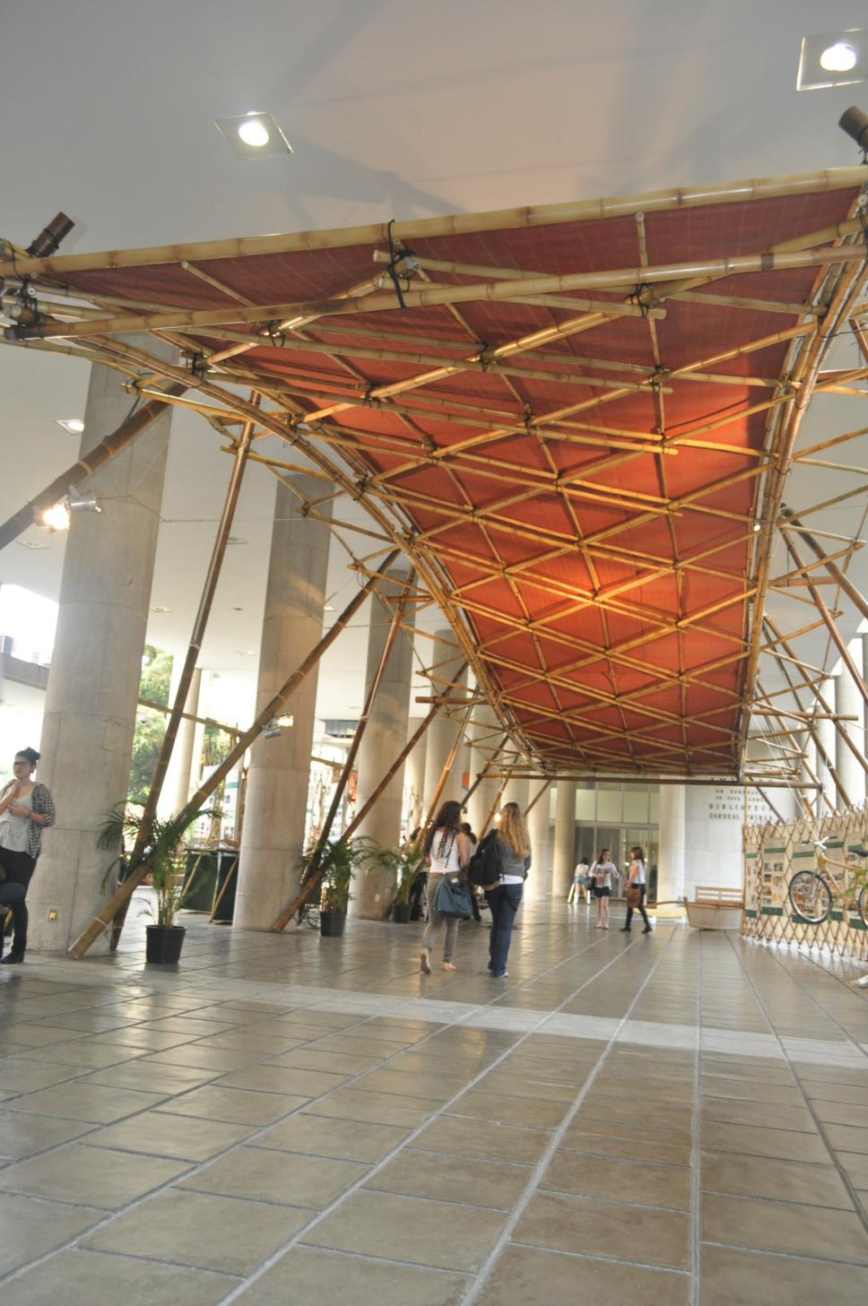 Exposição com estruturas e objetos feitos com bambu onde se mostra o uso de materiais não convencionais e tecnologias sustentáveis.