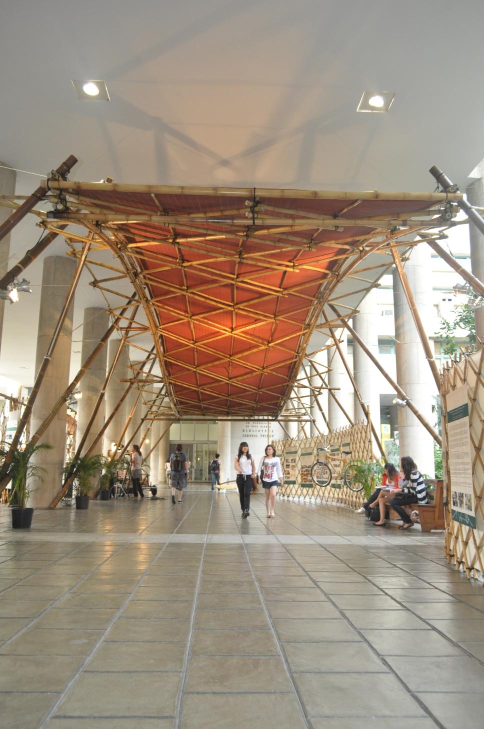 Exposição com estruturas e objetos feitos com bambu onde se mostra o uso de materiais não convencionais e tecnologias sustentáveis.