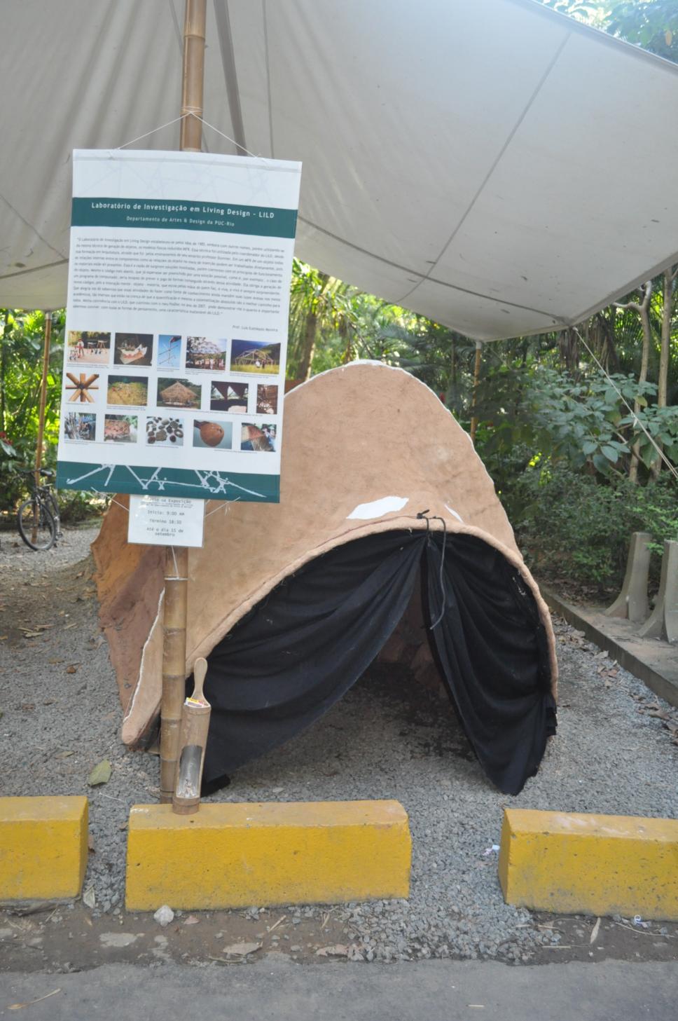 Exposição com estruturas e objetos feitos com bambu onde se mostra o uso de materiais não convencionais e tecnologias sustentáveis. Trabalho em barro, Laboratório de Living Design.