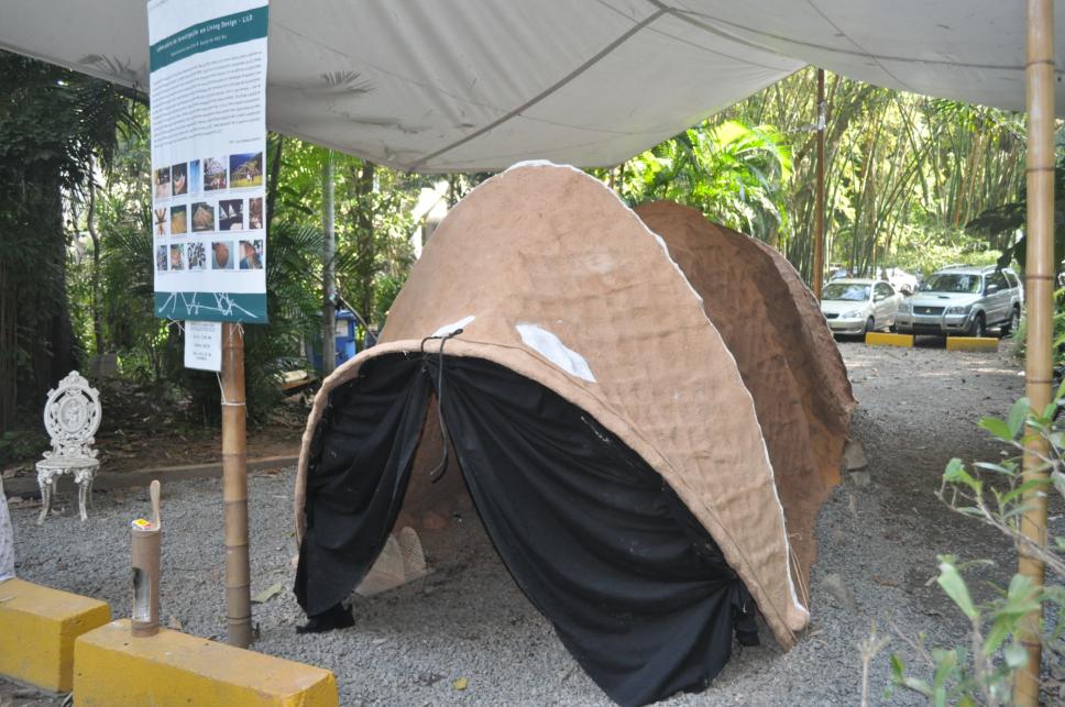 Exposição com estruturas e objetos feitos com bambu onde se mostra o uso de materiais não convencionais e tecnologias sustentáveis. Trabalho em barro, Laboratório de Living Design.