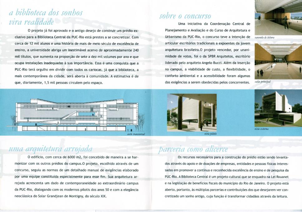 Folder de divulgação do projeto de construção do novo espaço para a Divisão de Bibliotecas e Documentação da PUC-Rio. Diz o texto que a "biblioteca dos sonhos vira realidade", e que o projeto vencedor do concurso promete "arquitetura arrojada".