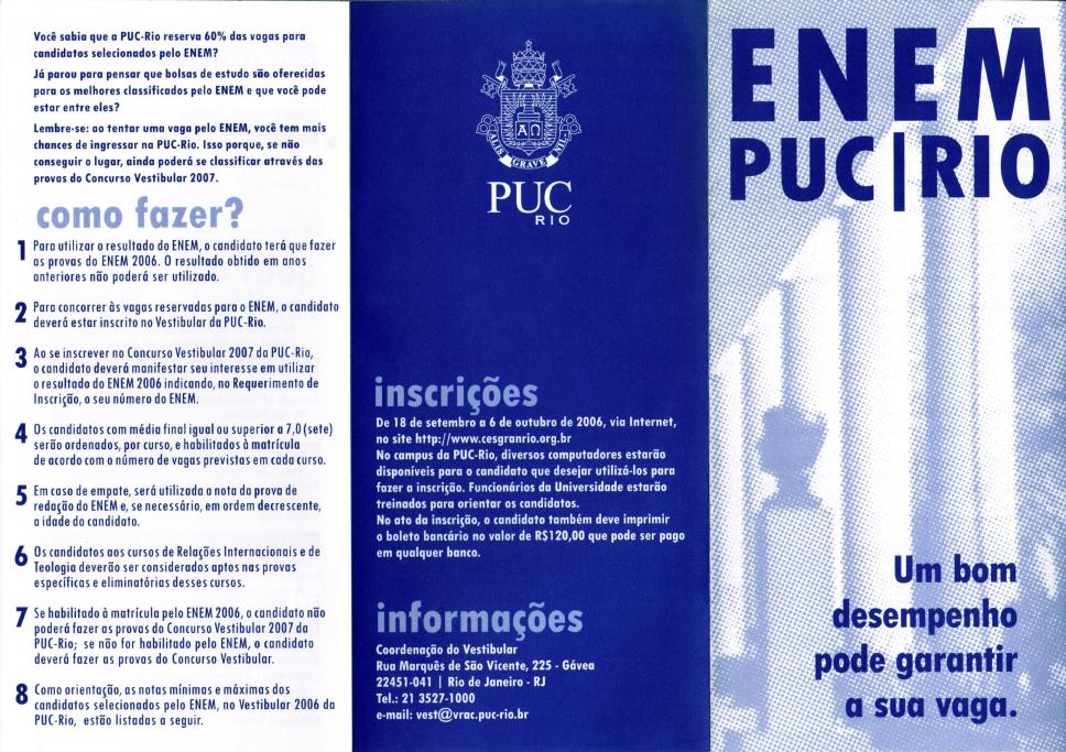 Divulgação de informações sobre o ENEM, que começava a ser utilizado pelas universidades como forma de acesso alternativa aos vestibulares. A PUC-Rio, neste momento, reservava 60% de suas vagas aos candidatos via ENEM. O candidato, ao se inscrever para o vestibular da PUC-Rio, indicava se queria utilizar sua nota do ENEM para a seleção na Universidade. Caso conseguisse classificação com a nota do ENEM, não precisava fazer o vestibular.