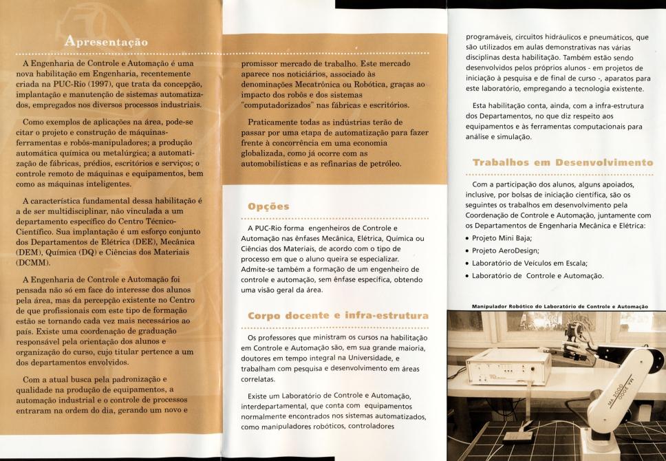 Apresentação do Curso de Engenharia de Controle e Automação. Opções (habilitações). Corpo docente e infraestrutura. Trabalhos em desenvolvimento. Foto de um pequeno braço robótico.
