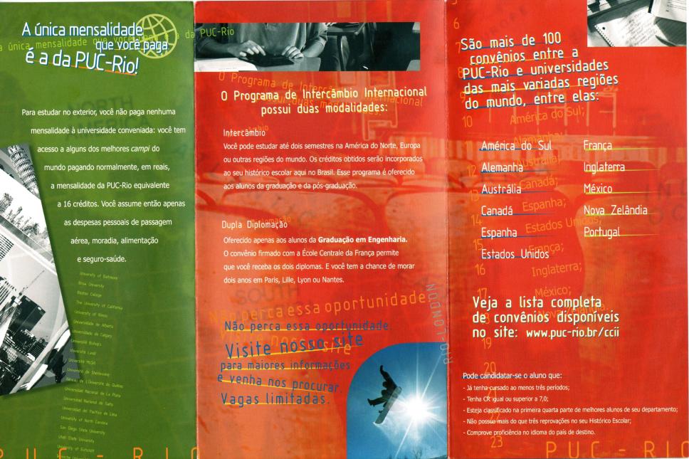 Apresentação das opções de intercâmbio oferecidas pela PUC-Rio. Condições para candidatar-se aos intercâmbios. Modalidades Intercâmbio e Dupla-diplomação. Países com os quais a PUC-Rio tinha convênio.