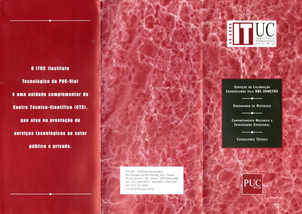 Apresentação do Instituto Tecnológico da PUC-RIO (ITUC) e dos serviços que ele prestava: Serviços de Calibração Credenciados pela RBC-Inmetro, Engenharia de Materiais, Comportamento Mecânico e Integridade Estrutural, Consultoria Técnica. Endereço.