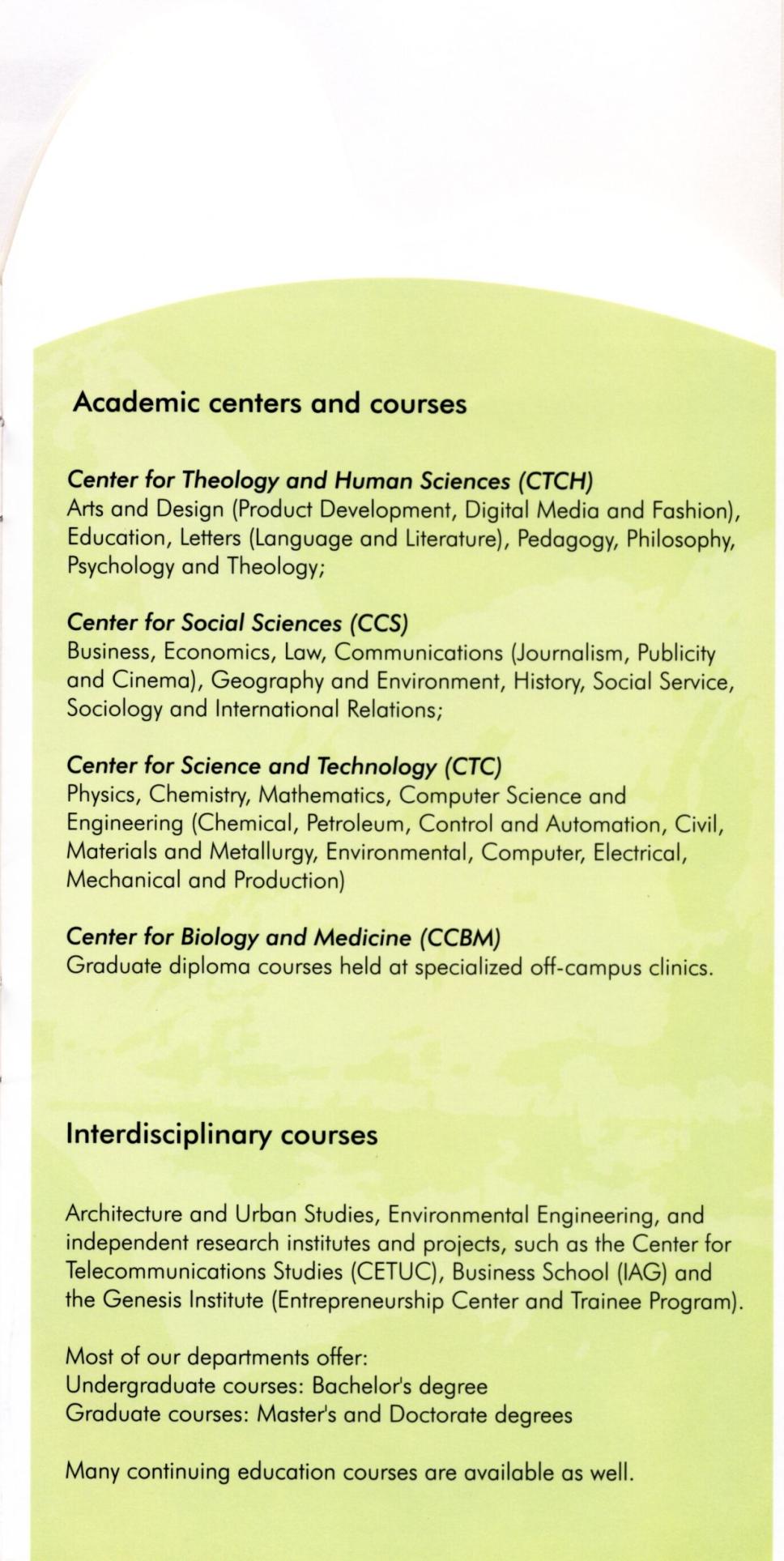 Folheto em inglês "Living in Rio - Study in English - Learn Portuguese". "Academic centers and courses", "Interdisciplinary courses".