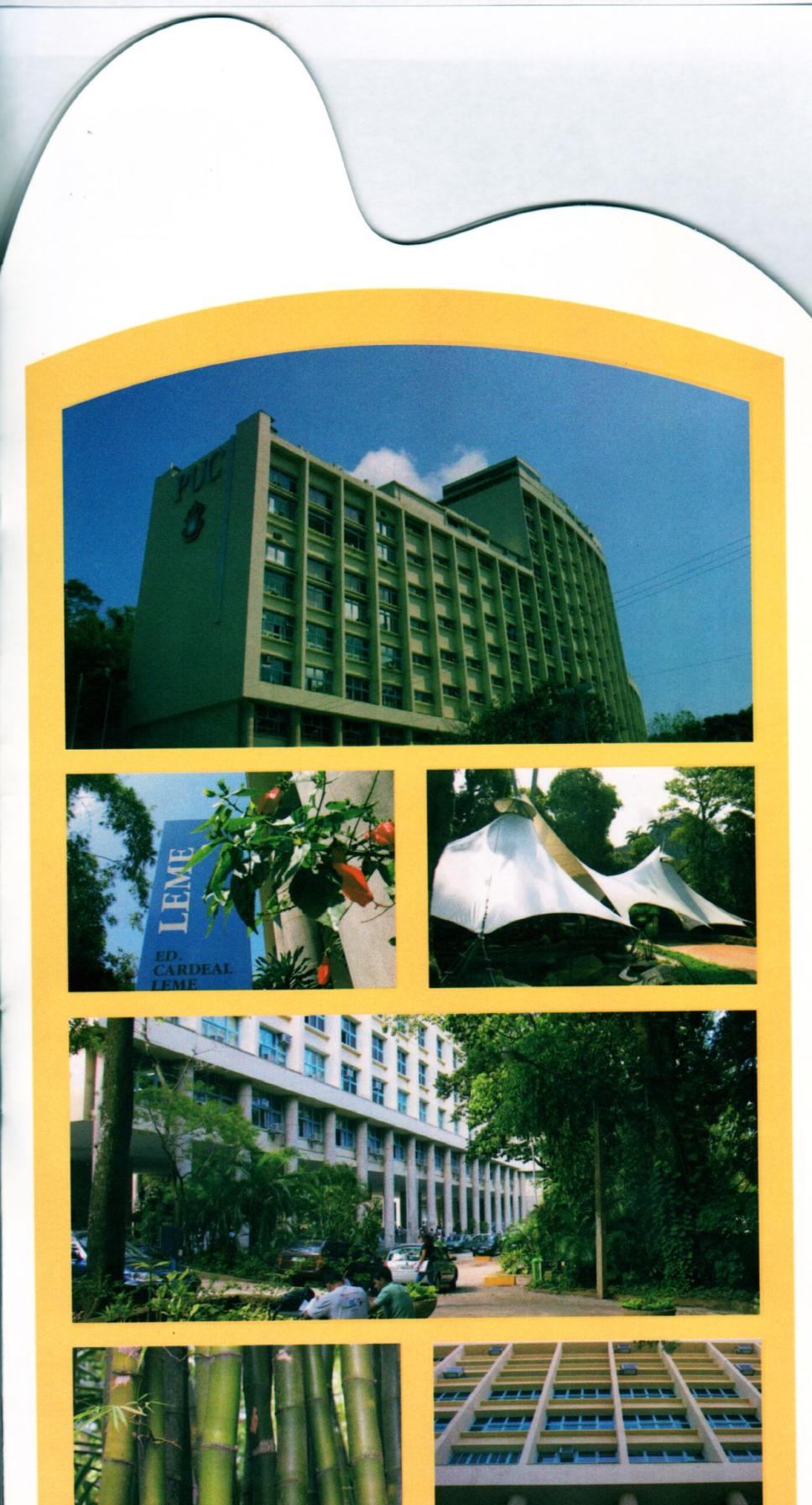 Folheto em inglês "Living in Rio - Study in English - Learn Portuguese". Fotos de diversos locais da PUC-Rio.