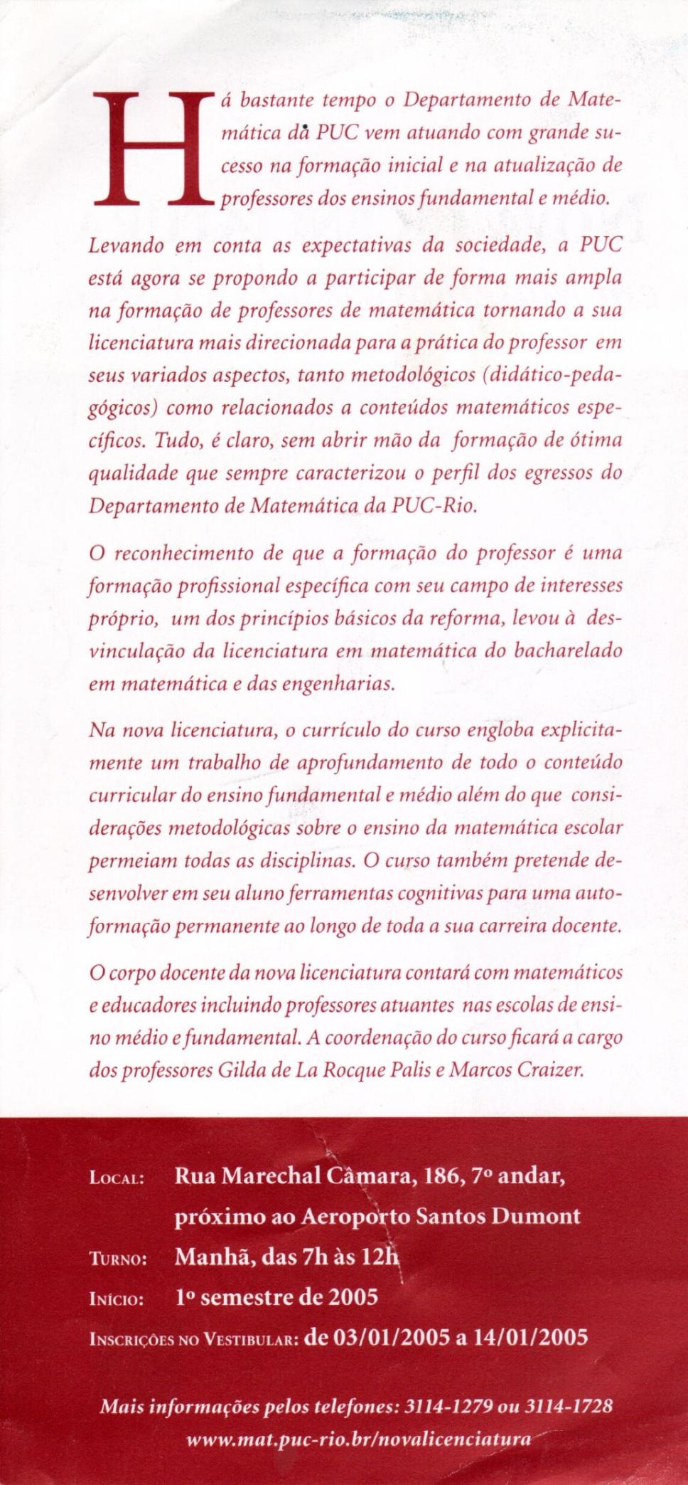 Folheto sobre a nova licenciatura em Matemática, oferecida na sede do Centro à rua Marechal Câmara. Seria de manhã, de 7 às 12h.