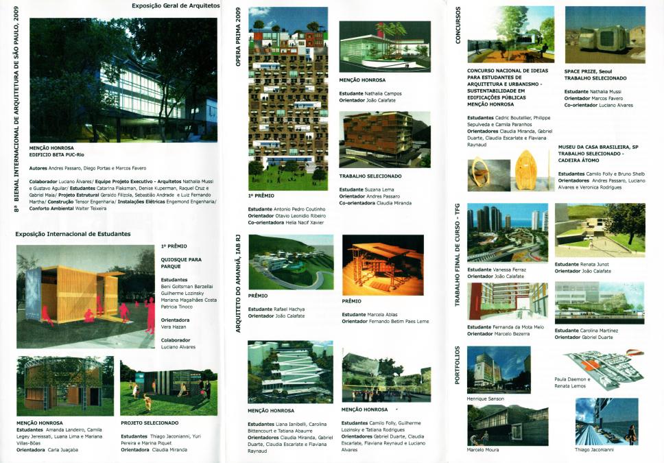 Folder de exposição do Curso de Arquitetura e Urbanismo - PRUMO 2010. Ilustrações dos projetos expostos, alguns premiados ou participantes de outras exposições nesta época, entre eles o Edifício Beta.