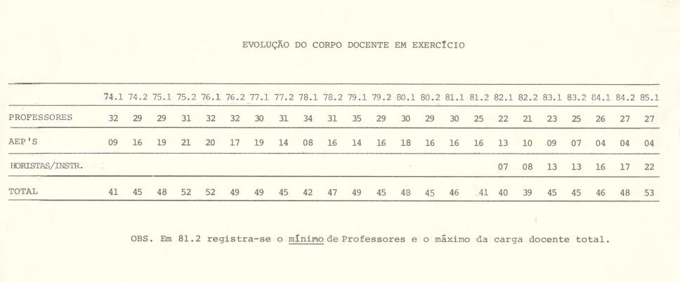 Contagem dos professores, AEP's, Horistas e a totalidade do corpo docente entre 1974 e 1985.