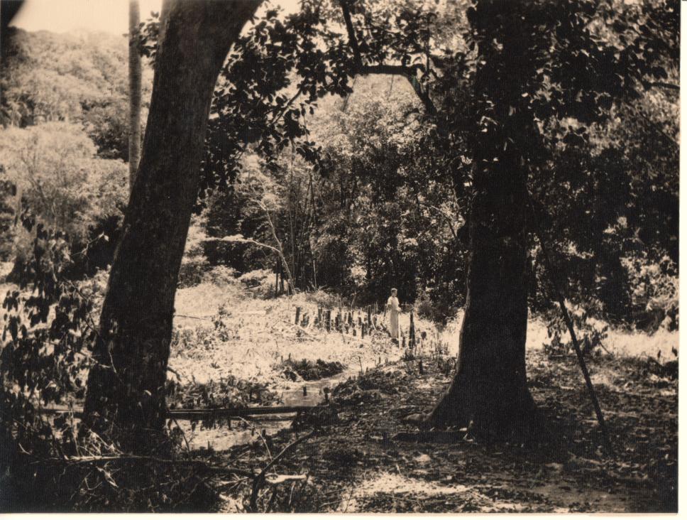 Terreno do novo campus da Gávea ainda com a mata original. No meio da imagem há uma pessoa ao lado de um pequeno córrego.