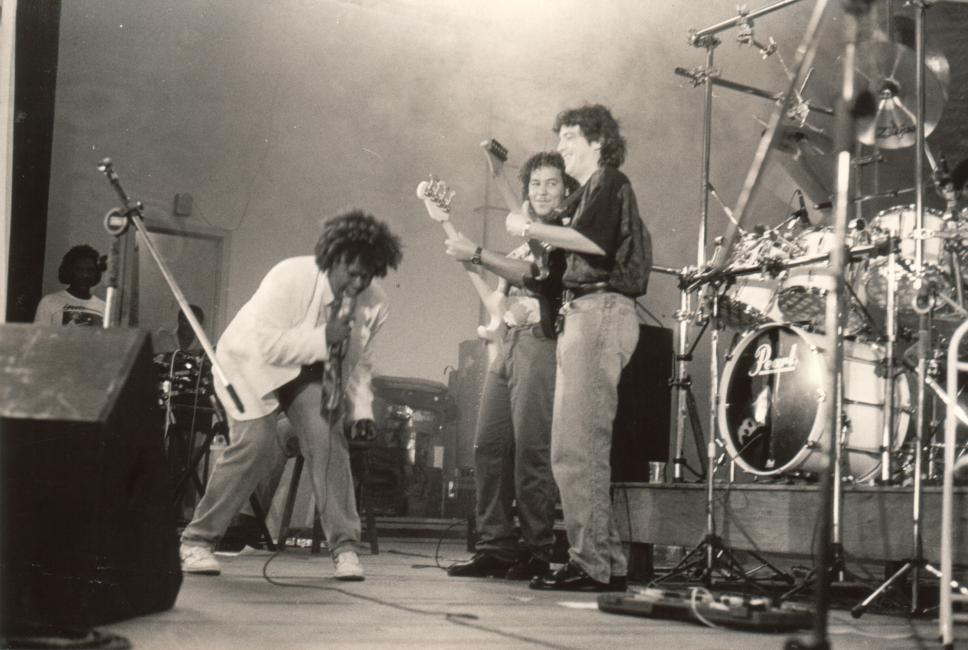 Com microfone: Sandra de Sá; na guitarra, ao lado da bateria: Celso Blues Boy