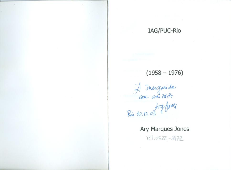 Contracapa da publicação do IAG PUC-Rio 1958 - 1976. Com dedicatória de Ary Jones à Margarida, datada de 10/12/2003.