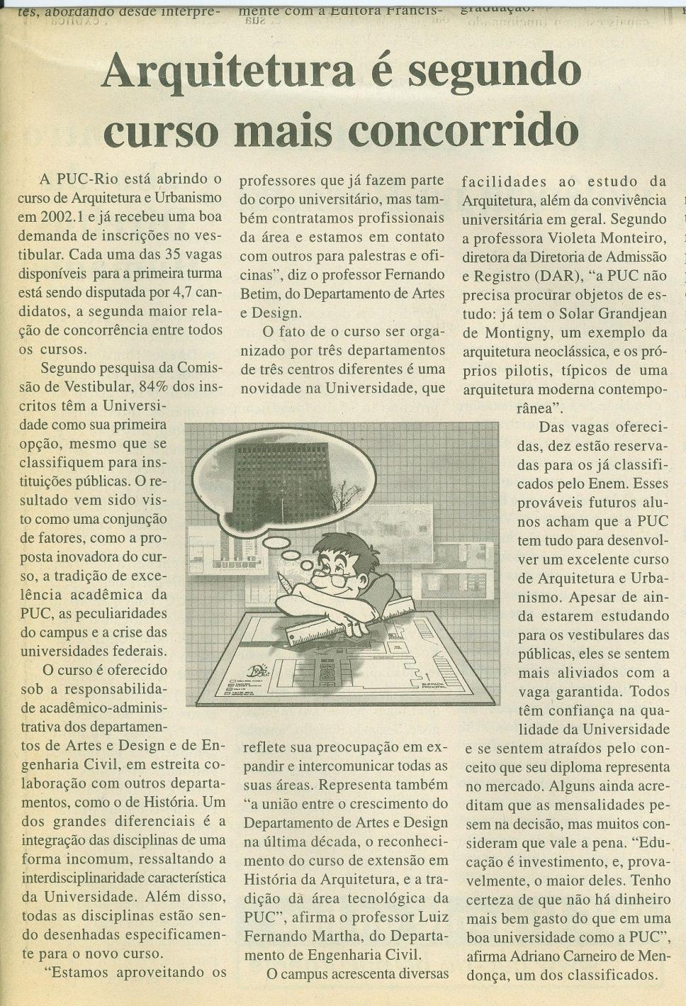 Matéria publicada no Jornal da PUC, Ano XIII, nº 110, em dezembro de 2001, tratando do exame vestibular para o curso de Arquitetura e Urbanismo.