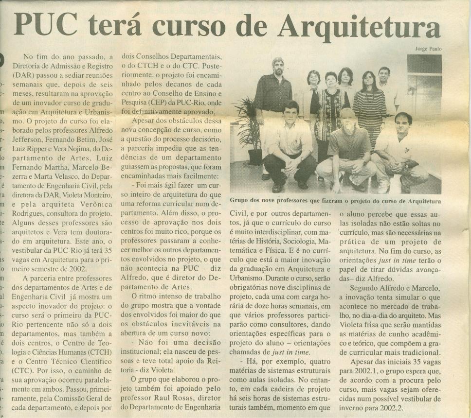 Matéria publicada no Jornal da PUC, Ano XIII, nº 106, em julho de 2001, tratando do projeto de criação do curso de Arquitetura e Urbanismo
