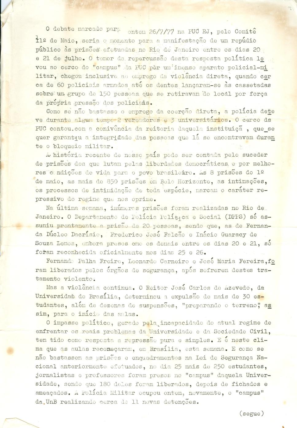 Frente. Sobre o bloqueio militar na PUC-Rio em 20/21 de julho e debate sobre tal acontecimento, marcado para 26 de Julho.