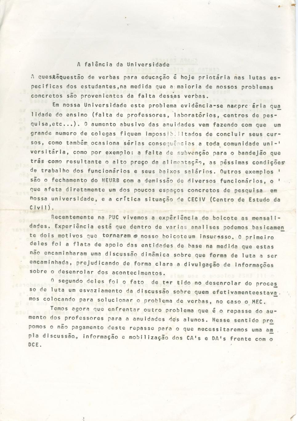 Análise dos problemas enfrentados pela PUC-Rio (alta de anuidades, baixos salários, precária qualidade de ensino, fechamento do NEURB) e chamada aos Cas e Das para mobilização com o DCE.