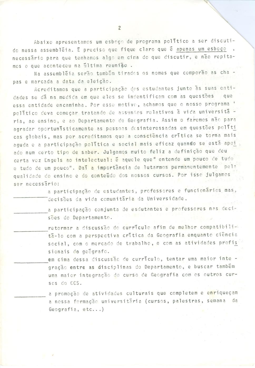 Página 02. Programa político a ser apresentado na assembleia dos estudantes de Geografia para discutir a criação de um centro Acadêmico.