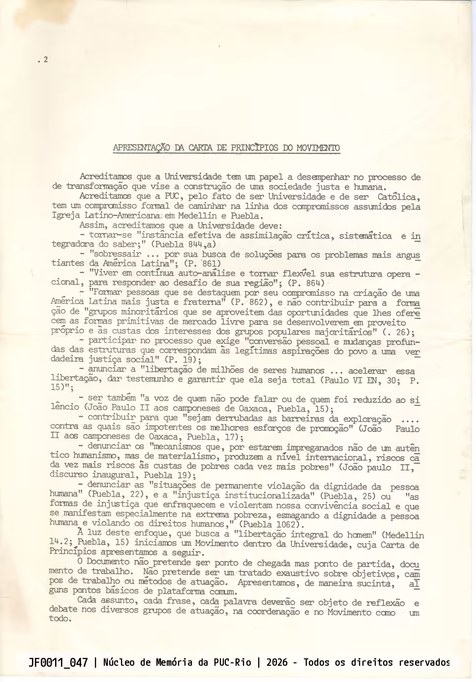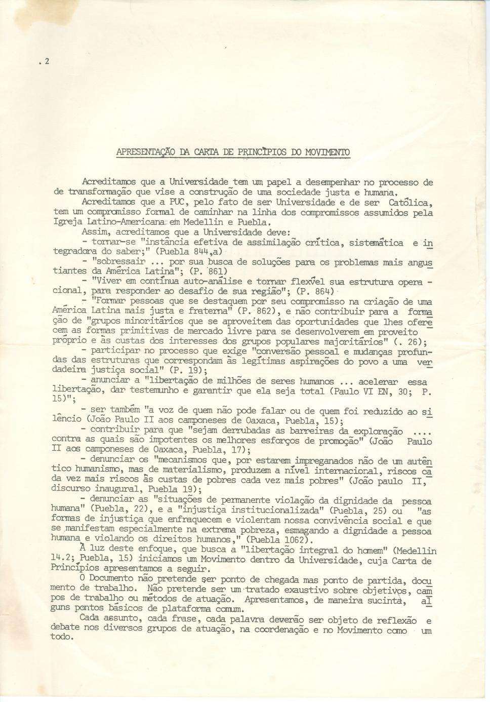Página 01. Apresentação dos princípios do MUSP - Movimento Universidade a Serviço do Povo, baseados na linha de compromissos assumidos pela Igreja Latino-Americana em Medellin e Puebla.
