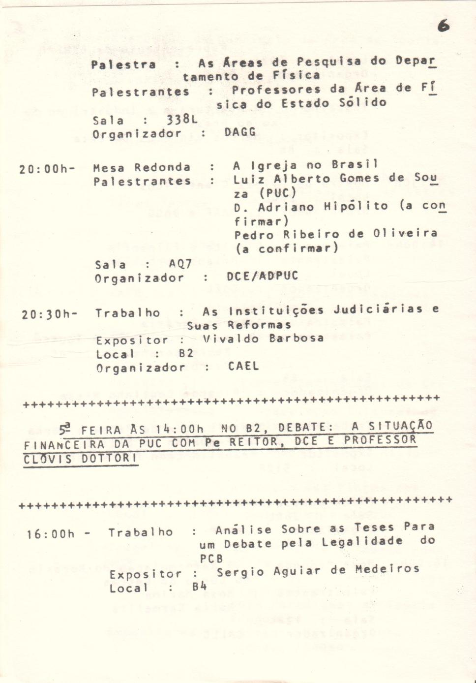 Programação do IV Congresso Interno da PUC-Rio. Página 6. Continuação das atividades do segundo dia do Congresso, 06/10/1981, incluindo mesas redondas, palestras e apresentação de trabalhos. DAAG, DCE, ADPUC, CAEL.
