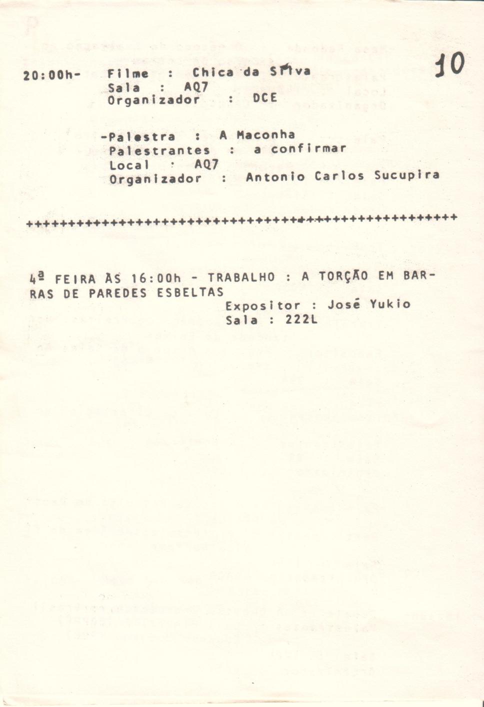 Programação do IV Congresso Interno da PUC-Rio. Página 10. Continuação das atividades do terceiro dia do Congresso, 07/10/1891, incluindo palestra, exposição de trabalho e mostra do filme Chica da Silva.