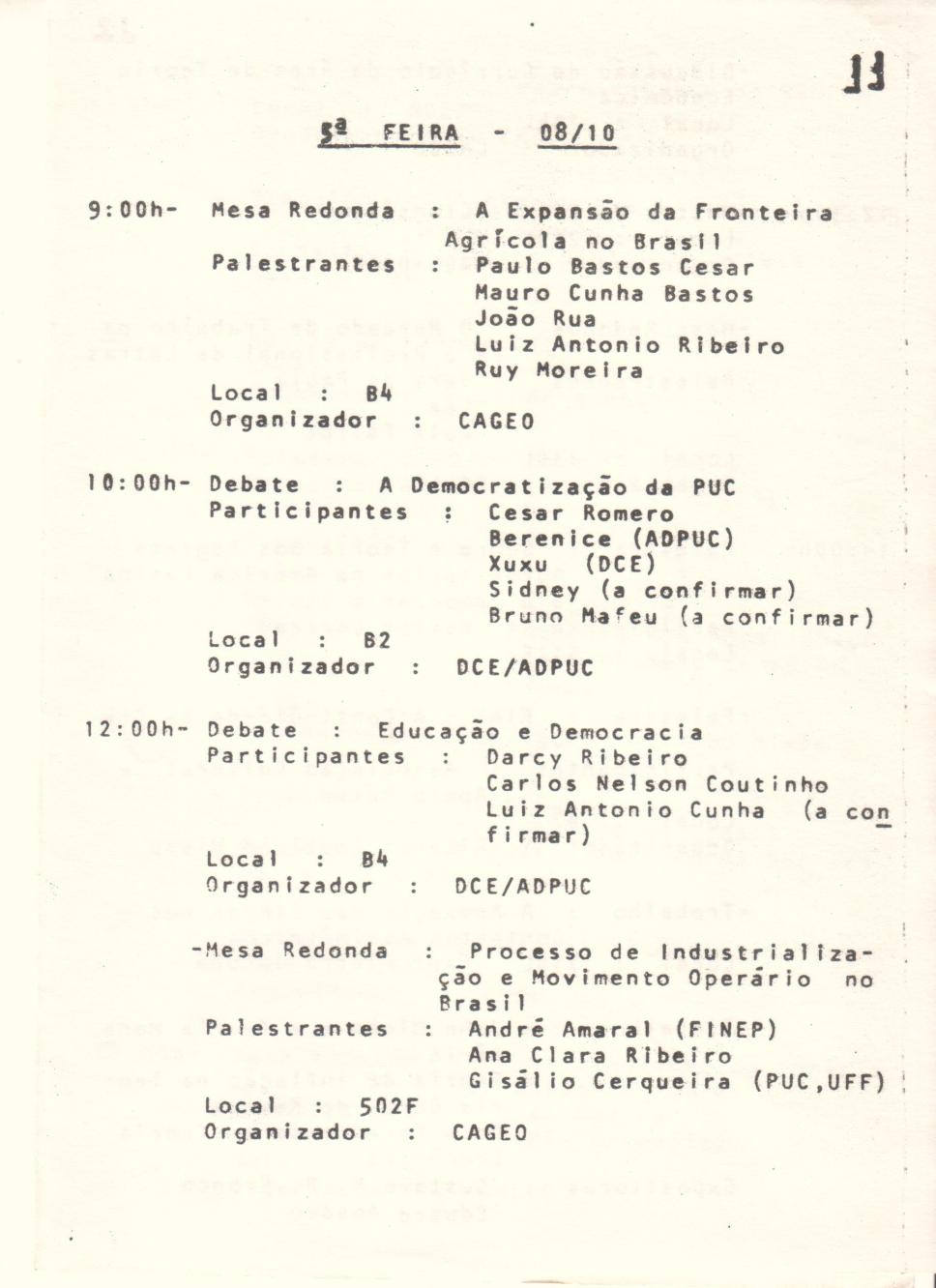 Programação do IV Congresso Interno da PUC-Rio. Página 11. Atividades do quarto dia do Congresso, 08/10/1981, incluindo mesas redondas e debates. CAGEO, DCE, ADPUC.