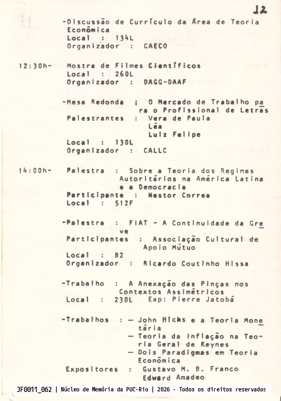 Programação do IV Congresso Interno da PUC-Rio. Página 12. Continuação das atividades do quarto dia do Congresso, 08/10/1981, incluindo mostras de filmes, palestras e exposição de trabalhos. CAECO, DAAF, DAGG, CALLC.