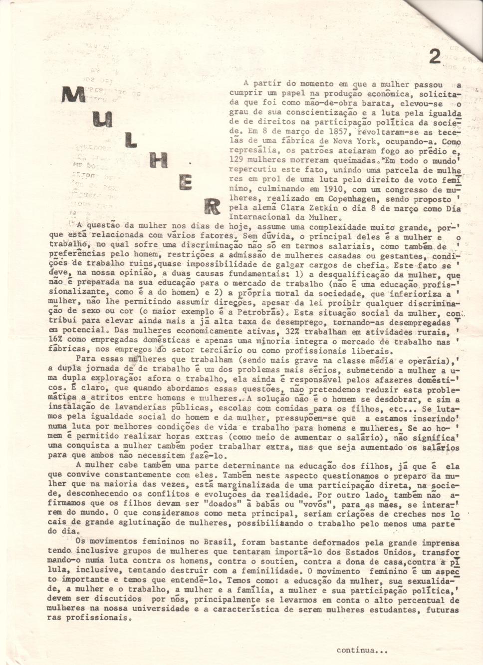 página 02. Sem número. Informe do Diretório Adhemar Fonseca sobre a mulher: a história do Dia Internacional da Mulher, sua figura na atualidade e movimentos femininos.