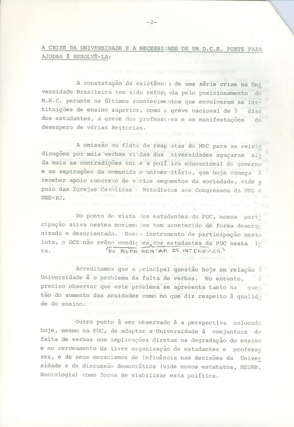 Página 02. Meio de discussão sobre o DCE. MEC, greve de estudantes e de professores, problema de verbas, UNE, UEE, problema das anuidades, NEURB.