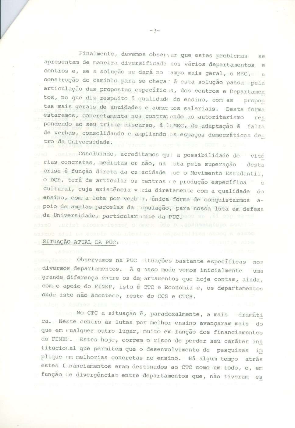 Página 03. Meio de discussão sobre o DCE. MEC, movimento estudantil, FINEP, diferença entre os departamentos, situação do CTC.