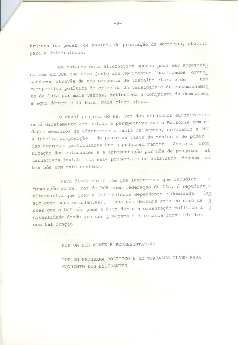Página 09. Meio de discussão sobre o DCE. Movimento estudantil, crise da universidade, luta por verbas, projeto dos estatutos autoritários.