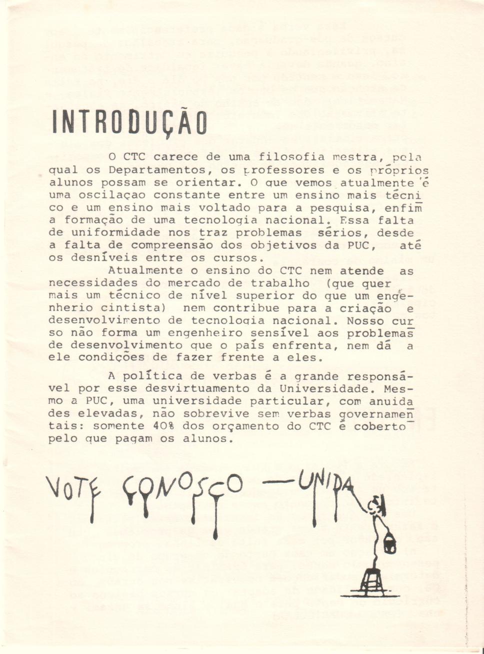 Coleção Acervo do professor Alfredo Jefferson relacionado ao DCE da PUC-Rio Código exclusivo jf0013_060 Data da criação Ano 1977 Data de criação Sáb, 01/01/1977 - 12:00 Referente a Diretório Central de Estudantes (DCE) Identificação Original Unidade - DAAF Descrição Página 01. Publicação da chapa Unidade. Introdução sobre a situação do CTC.
