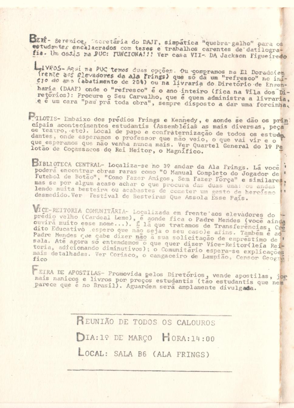 Publicação do DCE. Informe com ´verbetes´ úteis para o calouro, como Berê, livros, Biblioteca Central, pilotis, Vice-Reitoria Comunitária e feira de apostilas, além do horário da reunião dos calouros.