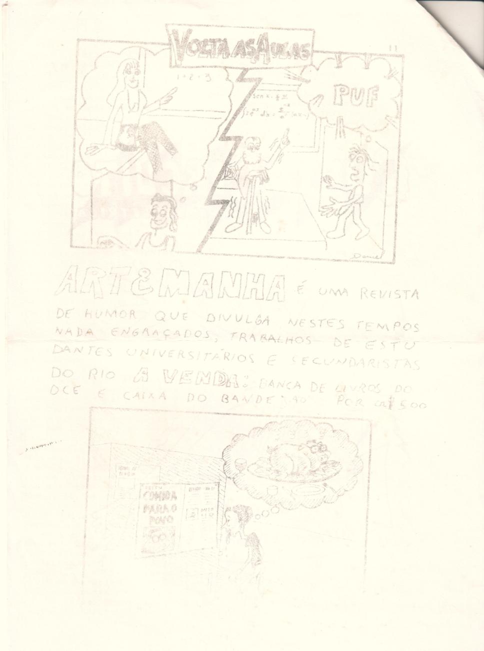 Coleção Acervo do professor Alfredo Jefferson relacionado ao DCE da PUC-Rio Código exclusivo jf0014_002 Data da criação Ano 1979 Data de criação Seg, 01/01/1979 - 12:00 Referente a Diretório Acadêmico Adhemar Fonseca - Engenharia (DAAF) Identificação Original Curto Circuito - o jornal da Elétrica Descrição Charge-propaganda da revista Art&Manha