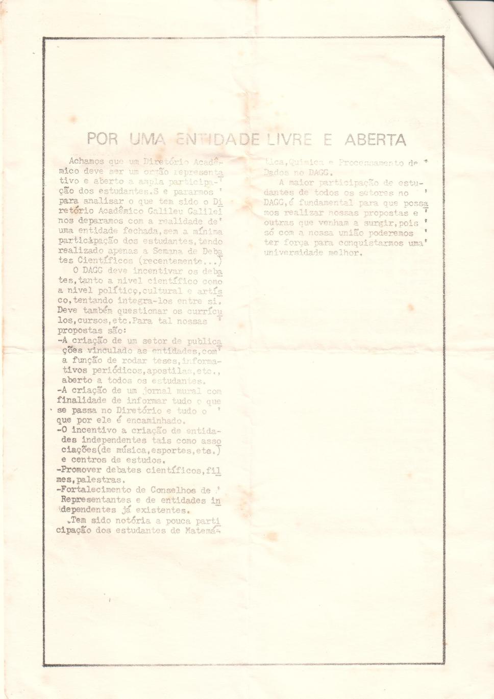 Material de campanha da chapa Viração ao Diretório Acadêmico Galileu Galilei. Propostas para o Diretório Acadêmico. "Por uma entidade livre e aberta".