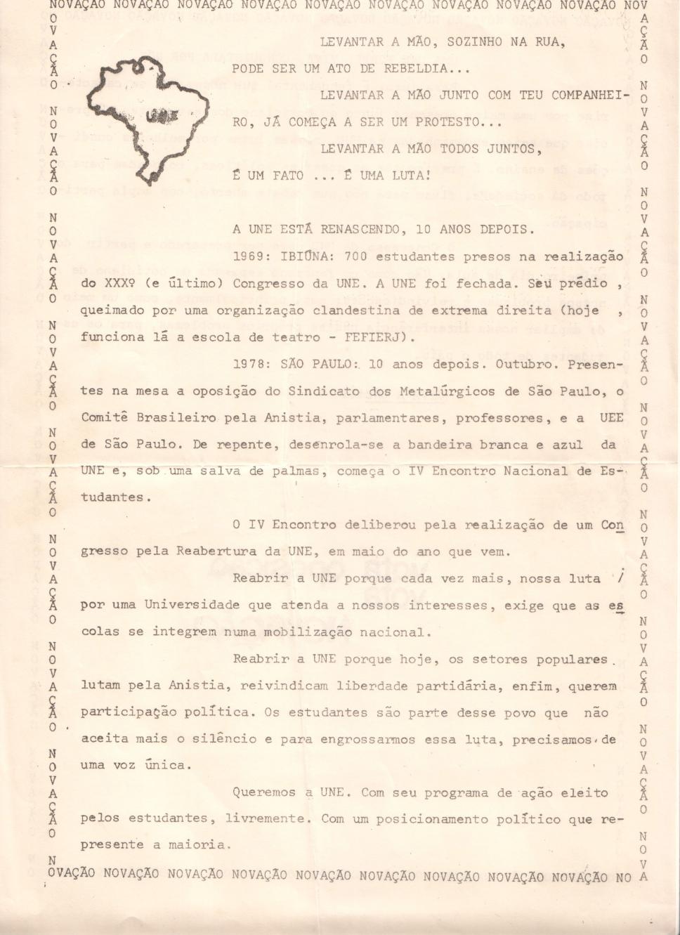 Renascimento da UNE, 10 anos após o congresso de Ibiúna, em 1969. IV Encontro Nacional dos Estudantes.