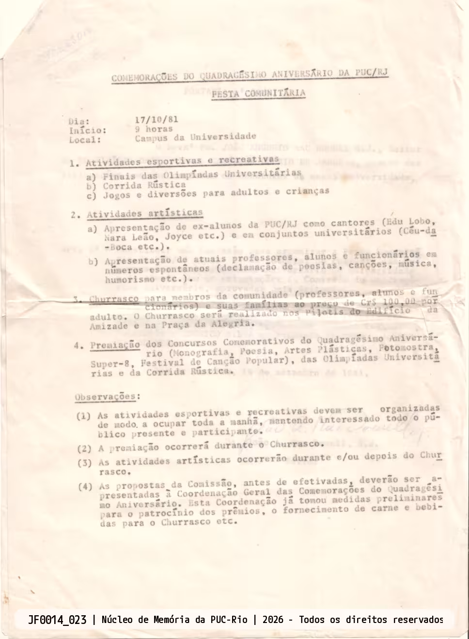 Programação da festa comunitária pelo comemoração dos 40 anos da PUC-Rio, incluindo: atividades esportivas, recreativas e artísticas, churrasco e premiação de concursos. Previstos: apresentação de ex-alunos como Edu Lobo, Joyce, Nara Leão e Céu da Boca; churrasco; premiação dos concursos de monografia, poesia, artes plásticas, fotomostra, super-8 e do Festival de Música.